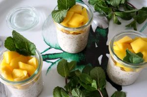 Au moment de servir, garantissez chacune des verrines de dés de mangue et feuilles de menthe. Vos verrines sont prêtes. Vous pouvez également remplacer les mangues par des fraises ou du kiwi ! Bon appétit ! N’oubliez pas de partager vos prouesses avec nous ! #QFAL !!!!